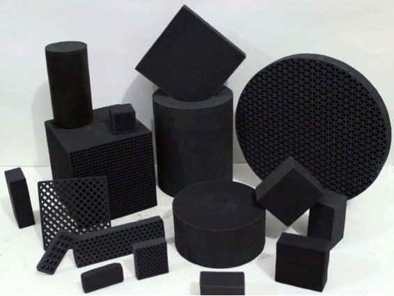 活性炭,是黑色粉末状或块状、颗粒状、蜂窝状的无定形碳,也有排列规整的晶体碳,具有很大的比表面积,对气体中的无机或有机物质及胶体颗粒等都有良好的吸附能力。如下图: